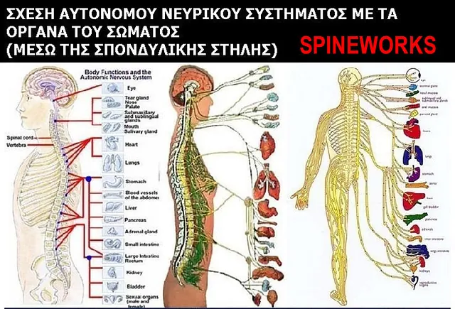Το αυτόνομο νευρικό σύστημα διαμέσου της σπονδυλικής στήλης ελέγχει και συντονίζει όλα τα όργανα και τις δομές του ανθρωπίνου σώματος (gray’s anatomy) βοηθώντας όλα τα όργανα και συστήματα του οργανισμού να βρίσκονται σε υγιή κατάσταση. Τα ανθρώπινα όργανα λειτουργούν λόγω της εννεύρωσης (νευρικές ώσεις που δέχονται από τον εγκέφαλο μέσω του αυτόνομου νευρικού συστήματος από τη σπονδυλική στήλη).